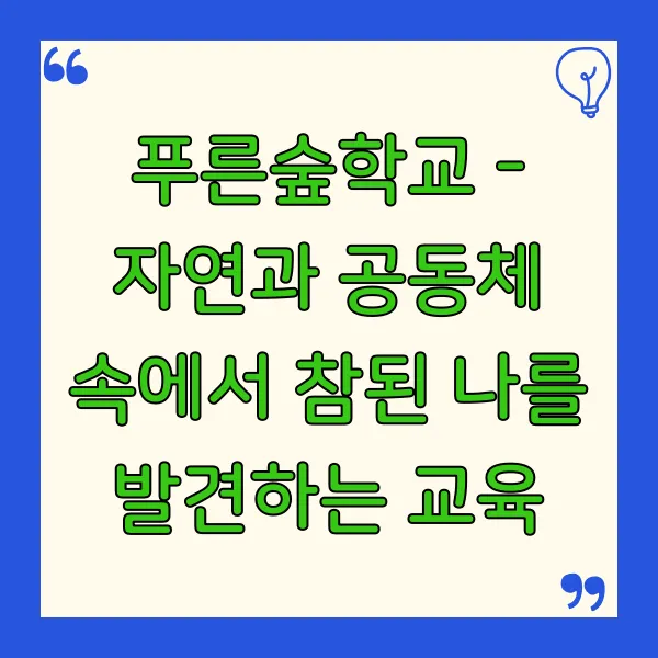 2002년 개교 이래, 푸른숲학교는 '더불어 배우고 삶을 가꾸는 배움터'라는 기치 아래, 학생 한 명 한 명의 고유한 가치를 존중하고 잠재력을 최대한 발현시키는 교육 을 실천해 왔습니다. 본 포스트에서는 푸른숲학교가 어떤 철학을 바탕으로, 어떠한 특별한 교육과정을 운영하며, 학생들을 어떻게 미래의 주역으로 성장시키고 있는지 심도 있게 분석하고 소개하고자 합니다.